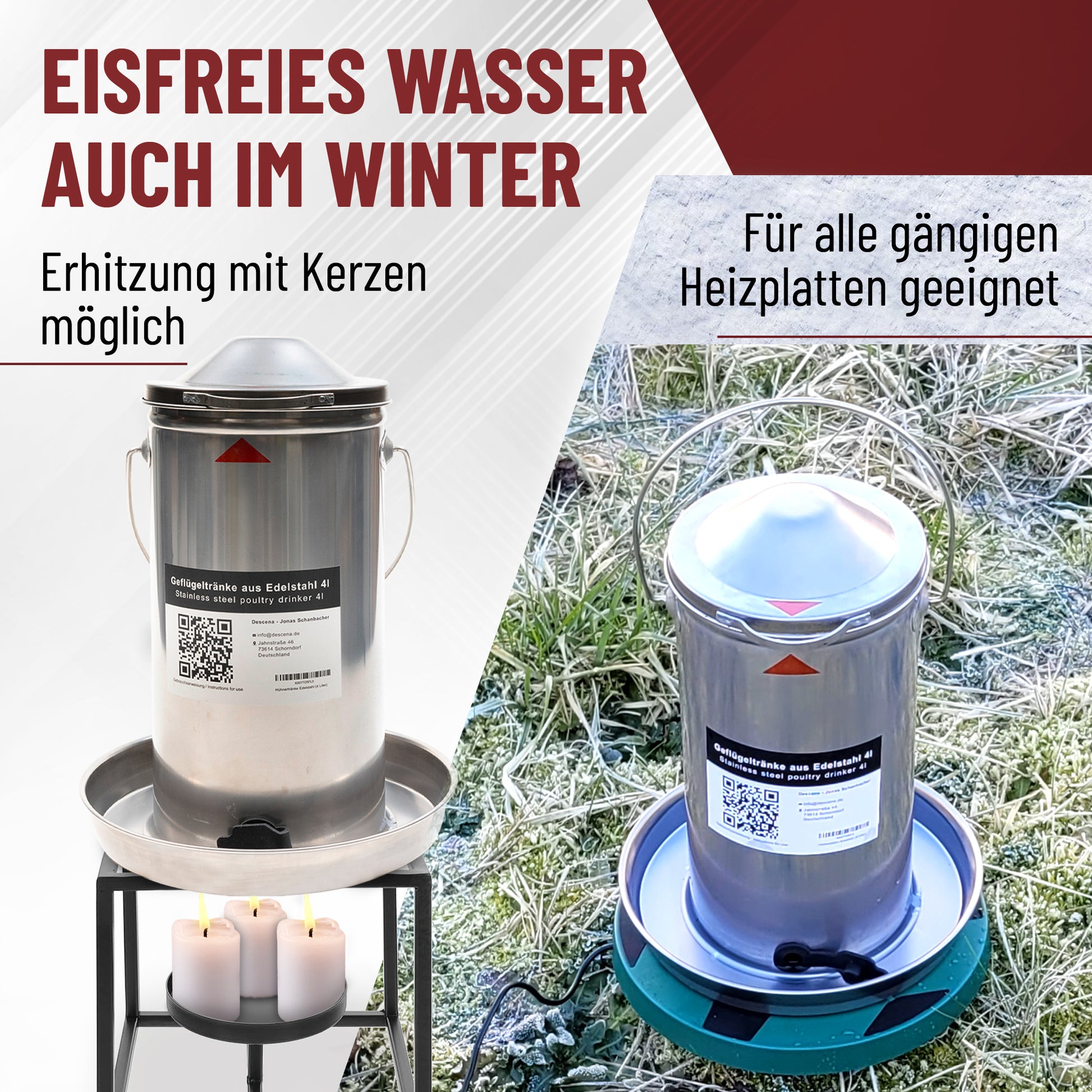 • BEHEIZBAR & FROSTSICHER: Der Edelstahlboden kann mit einem Teelicht erwärmt werden – frostfrei ohne Strom. Kompatibel mit gängigen Tränkenwärmern.